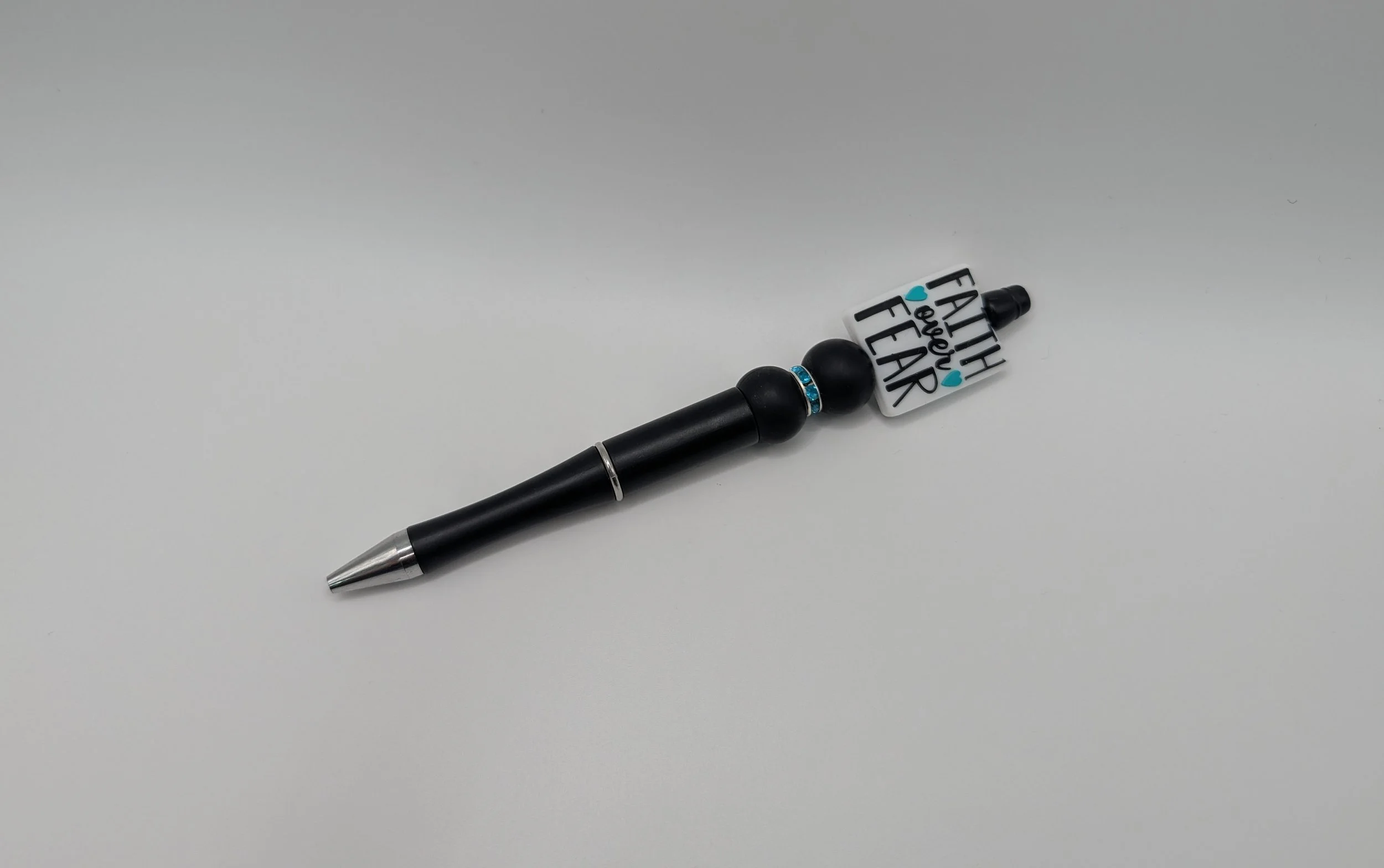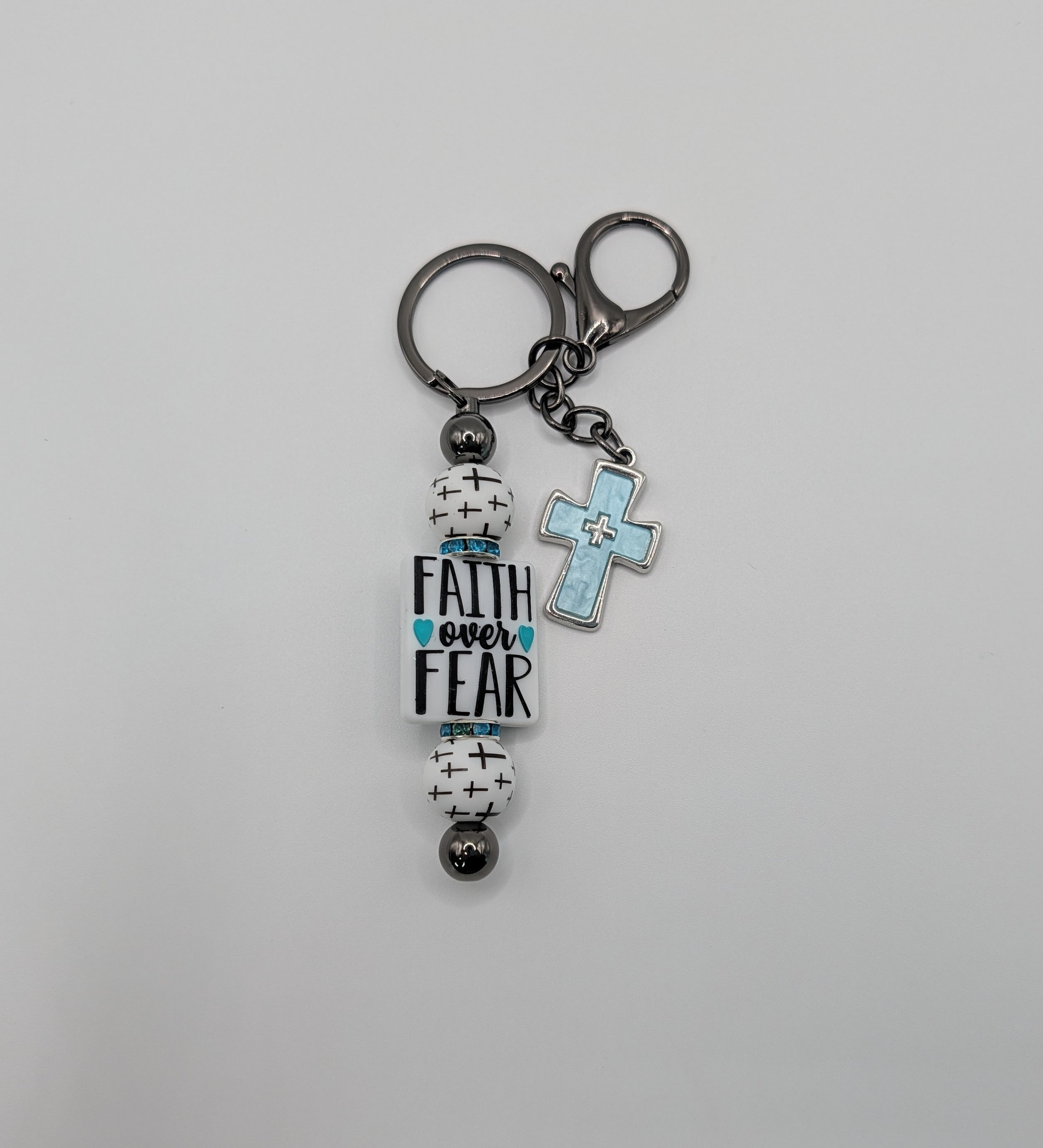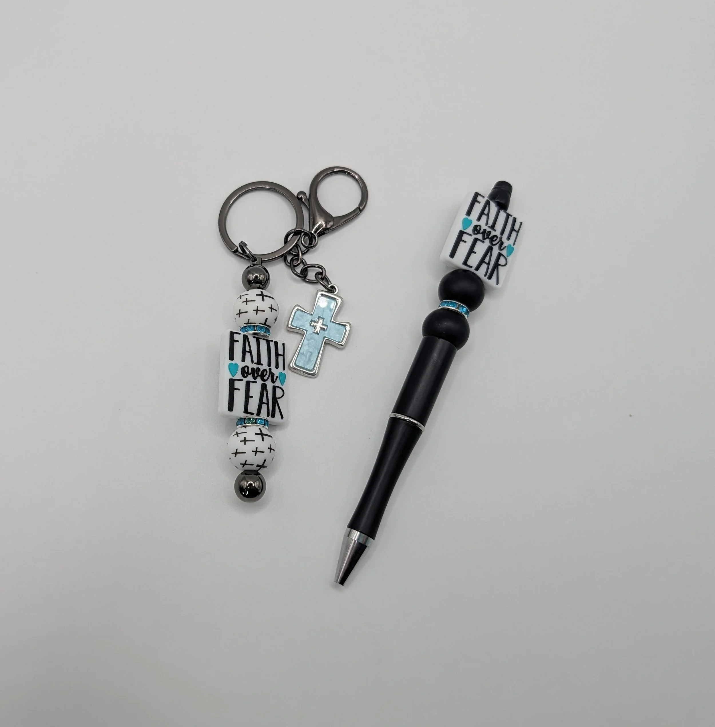 Faith Over Fear handmade pen and keychain set. The beaded keychain is easily used as bag charms for backpacks or purse. Thoughtful keepsake for yourself or a meaningful, faith-filled gift for any special occasion.